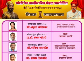 दि.२२(पीसीबी)- गांधीपेठ तालीम मित्रमंडळ आयोजित पाच दिवसीय जिजाऊ व्याख्यानमालेचा प्रारंभ रविवार, दिनांक २६ एप्रिल २०२६ पासून होत असून चापेकर स्मारक उद्यान, चापेकर...