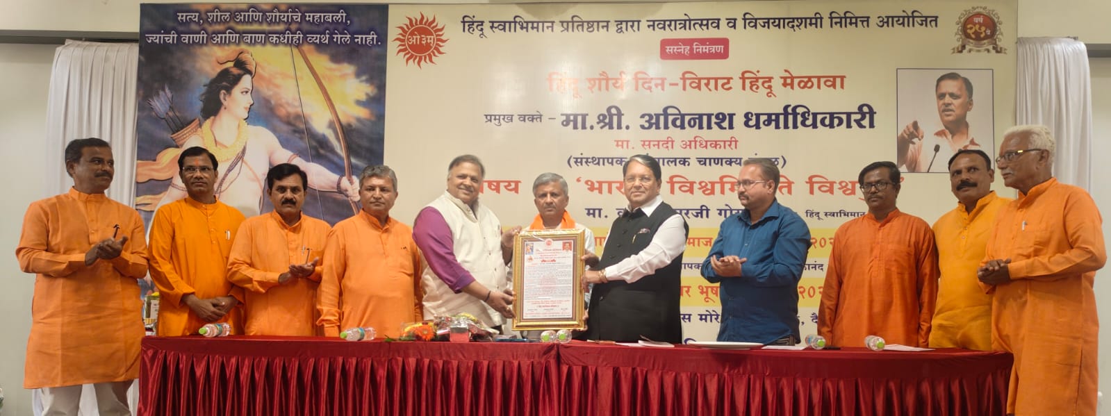 हिंदू स्वाभिमान प्रतिष्ठानच्या वतीने रविवारी (दि.५) आरंभ बँक्वेट हॉल, भोईर लॉन्स, काळेवाडी पिंपरी येथे हिंदू शौर्य दिन, नवरात्र उत्सव व विजयादशमी चे औचित्य साधून “विराट हिंदू मेळावा आणि पुरस्कार वितरण” सोहळ्याचे आयोजन करण्यात होते. याचे उद्घाटन संस्थेचे अध्यक्ष कृष्णकुमार गोयल यांच्या हस्ते करण्यात आले. यावेळी माजी सनदी अधिकारी अविनाश धर्माधिकारी हे “भारत, विश्वमित्र ते विश्वगुरू” या विषयावर व्याख्यान झाले. तसेच स्वामी विवेकानंद लोकसेवा प्रतिष्ठानचे संस्थापक अध्यक्ष रामराजे बेंबडे यांना ‘स्वर्गीय प्रा. एकनाथजी नाणेकर स्मृती समाज भूषण पुरस्कार २०२५’ आणि पिंपरीतील दै. लोकमतचे वृत्त संपादक डॉ. विश्वास मोरे यांना ‘स्वर्गीय संजय आर्य स्मृती पत्रकार भूषण २०२५’ हा पुरस्कार प्रदान करून गौरवण्यात आले.