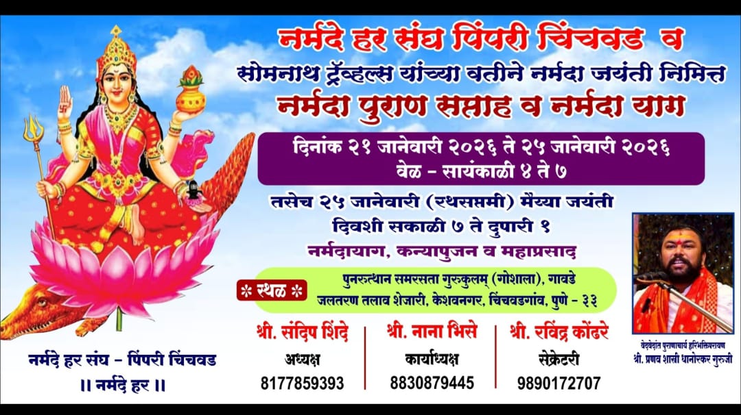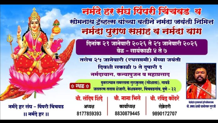 दि.१९(पीसीबी)-नर्मदा मैयाच्या जयंतीनिमित्त नर्मदे हर संघ पिंपरी चिंचवड यांच्या वतीने पिंपरी चिंचवड शहरात नर्मदा पुराण सप्ताह व नर्मदा यागाचे आयोजन करण्यात आले आहे. सुप्रसिद्ध कथा प्रवक्ते वेदमूर्ती प्रणव धानोरकर गुरुजी हे नर्मदा कथा कथन करणार आहेत. नर्मदा पुराणाचा हा कार्यक्रम पिंपरी चिंचवड शहरात गेल्या वर्षी प्रमाणेच यावर्षी देखील होत असल्याने जास्तीत जास्त नर्मदा भक्त व श्रोत्यांनी याचा लाभ घ्यावा असे आवाहन नर्मदे हर संघ पिंपरी चिंचवडचे अध्यक्ष संदीप शिंदे यांनी केले आहे.