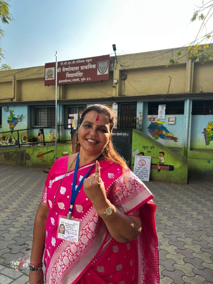 Pimpri प्रभाग क्र.८ च्या राष्ट्रवादीच्या उमदेवार सीमा सावळे यांनी बजावला मतदानाचा हक्क By PCB Author - January 15, 2026 0 2 Facebook Twitter Google+ Pinterest WhatsApp दि.१५(पीसीबी)-प्रभाग क्र ८ च्या राष्ट्रवादी काँग्रेस पक्षाचे अधिकृत उमेदवार व माजी स्थायी समिती सभापती सिमा सावळे यांनी आपली मतदानाचा हक्क बजावला.आपली लोकशाही अधिक बळकट करण्यासाठी सर्वांनी आपला मतदानाचा हक्क बजवावा असावं आवाहन त्यांनी केले आहे