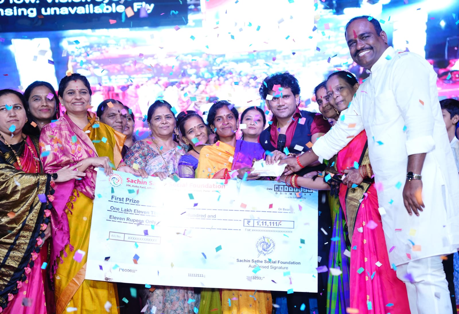 या कार्यक्रमात प्रथम क्रमांक विजेत्या पुष्पा लोकरे यांना मानाच्या पैठणी सह रोख १,११,१११/- रुपयांचे बक्षीस देण्यात आले. द्वितीय क्रमांक विजेत्या सुनिता सत्यनारायण क्षीरसागर यांना रुपये ५१,१११/- रोख व मानाची पैठणी, तृतीय क्रमांक विजेत्या निकिता ऋषिकेश माने यांना रुपये ३१,१११/- रोख व मानाची पैठणी देऊन सन्मानित करण्यात आले. तसेच अमृता संदीप हळदणकर, गजराबाई मुरलीधर काटे, किरण अरुण पाटील, सोनाली आशुतोष देसले आणि अमृता रामेश्वर दहे या लकी ड्रॉ विजेत्यांना प्रत्येकी ११,१११/- रोख व आकर्षक साडी देऊन गौरविण्यात आले. तसेच उपस्थित प्रत्येक महिला भगिनींना प्रोत्साहन देण्यासाठी आकर्षक साडी भेट देण्यात आली. क्रांतीनाना मळेगांवकर यांनी न्यू होम मिनिस्टर खेळ पैठणीचा या कार्यक्रमाचे सादरीकरण केले. सचिन साठे सोशल फाऊंडेशन च्या सर्व पदाधिकारी व कार्यकर्त्यांनी कार्यक्रमाचे उत्कृष्ट संयोजन केले होते.