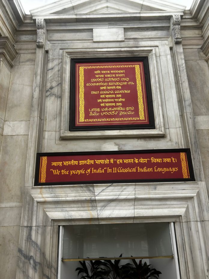 या ग्रंथ कुटीर दालनातील एका भिंतीवर ज्येष्ठ सुलेखनकार अच्युत पालव यांनी “हम भारत के लोग” हा मजकूर भारताला अभिजात भाषेचा दर्जा मिळालेल्या असामी, बंगाली, कन्नड, मल्याळम, मराठी, ओडिया, पाली, प्राकृत, संस्कृत, तामिळ आणि तेलुगू या ११ भाषांमध्ये सुलेखनातून साकारला आहे.