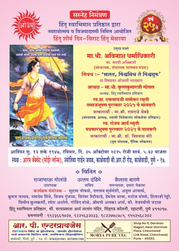 पिंपरी,दि.४(पीसीबी)- नवरात्र उत्सव व विजयादशमी चे औचित्य साधून हिंदू शौर्य दिनानिमित्त “विराट हिंदू मेळावा आणि पुरस्कार वितरण” सोहळ्याचे आयोजन करण्यात आले आहे अशी माहिती हिंदू स्वाभिमान प्रतिष्ठानचे उपाध्यक्ष राजाभाऊ गोलांडे यांनी प्रसिद्धीस दिली आहे. रविवारी (दि.५ ऑक्टोबर) सायंकाळी पाच वाजता आरंभ बँक्वेट हॉल (भोईर लॉन्स), ज्योतिबा गार्डन जवळ, काळेवाडी बिआरटी रोड, काळेवाडी, पिंपरी येथे या हिंदू विराट मेळाव्याचे उद्घाटन संस्थेचे अध्यक्ष कृष्णकुमार गोयल यांच्या उपस्थितीत होणार आहे. यावेळी माजी सनदी अधिकारी अविनाश धर्माधिकारी हे “भारत, विश्वमित्र ते विश्वगुरू” या विषयावर व्याख्यान देणार आहेत.