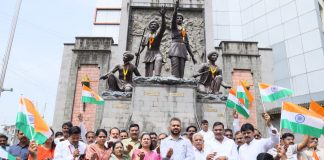 क्रांती दिनाचे औचित्य साधून क्रांतीवीर चापेकर बंधूंच्या समुह शिल्पास पुष्पहार अर्पण