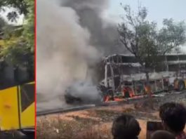 देवदर्शनाहून परतताना कार बसवर आदळल्याने लागलेल्या आगीत सहा प्रवाशांचा होरपळून मृत्यू