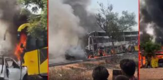 देवदर्शनाहून परतताना कार बसवर आदळल्याने लागलेल्या आगीत सहा प्रवाशांचा होरपळून मृत्यू
